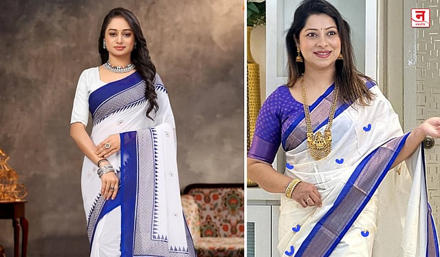पांढऱ्या साडीवर रॉयल ब्लू किंवा नेव्ही ब्लू ब्लाउज शोभून दिसेल. साधा स्लीव्हलेस, एल्बो लेंथ किंवा बोट नेक डिझाईन निवडल्यास क्लासी लूक मिळतो.