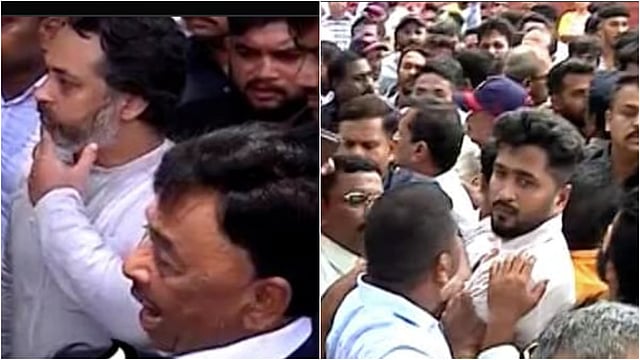 नारायण राणे आणि निलेश राणे चांगलेच आक्रमक झाले असताना राणे समर्थक आणि पोलिसांमध्येही बाचाबाची झाली. यावेळी निलेश राणे यांनी आक्रमक होत ‘ते बाहेरून येऊन अंगावर येणार का? त्यांना निघायला सांगा’, अशी भूमिका घेतली. भाजप आणि राणे समर्थकांनी मुख्य रस्ता अडवला. आदित्य ठाकरे यांनीही ‘गेलो तर मुख्य रस्त्यानेच जाणार,’ असा आक्रमक पवित्रा घेतल्याने राजकोट किल्ल्यावर प्रचंड तणाव निर्माण झाला आहे. ‘१५ मिनिटांत वाट मोकळी केली नाही, तर आम्ही किल्ल्यात घुसू,’ असा इशारा ठाकरे गटाचे आमदार वैभव नाईक यांनी दिला. मात्र घोषणाबाजी आणि धक्काबुक्कीमुळे वातावरण अधिकच चिघळले. दोन्ही गटांमध्ये वादावादी सुरू असतानाच जयंत पाटील यांनी दोन्ही बाजूचे नेते आणि कार्यकर्त्यांची भेट घेऊन परिस्थिती निवळण्यासाठी मध्यस्थी करण्याचा प्रयत्न केला. राणे आणि ठाकरे समर्थकांकडून आव्हान-प्रतिआव्हान सुरू असल्याने पोलिसांकडून दोन्ही गटांना रोखण्याचा प्रयत्न सुरू होता. मात्र दोन्हीकडचे कार्यकर्ते पोलीस यंत्रणेला न जुमानता एकमेकांवर धावून गेले. यावेळी काही कार्यकर्त्यांना मारहाण झाली. तसेच किल्ल्यामध्ये तणावाचे वातावरण निर्माण झाले असताना निलेश राणे यांची पोलिसांसोबत शाब्दिक चकमक झाली. तर नारायण राणे यांनीही प्रसारमाध्यमांच्या प्रतिनिधींना दमदाटी केली. जवळतास दीड तास ठाकरे, अंबादास दानवे आणि वैभव नाईक यांनी किल्ल्याच्या पायऱ्यांवर ठिय्या आंदोलन केले. मात्र, यानंतर पोलिसांनी दोन्ही बाजूच्या कार्यकर्त्यांना शांततेचे आवाहन करत समजूत घातली. यानंतर आदित्य ठाकरे, अंबादास दानवे, जयंत पाटील हे राजकोट किल्ल्यावरून बाहेर पडले.