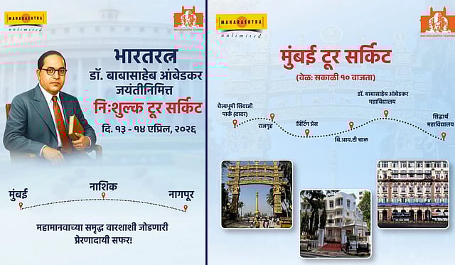 भारतरत्न डॉ. बाबासाहेब आंबेडकर यांच्या १३५ व्या जयंतीनिमित्त महाराष्ट्र शासनाच्या पर्यटन विभागांतर्गत पर्यटन संचालनालयाकडून १३ आणि १४ एप्रिल २०२६ रोजी 'डॉ. बाबासाहेब आंबेडकर टूर सर्किट' या विशेष उपक्रमाचे आयोजन करण्यात आले आहे. मुंबई, नाशिक आणि नागपूर येथे हा दौरा आयोजित करण्यात येणार असून, पर्यटक आणि अनुयायांसाठी हा प्रवास पूर्णपणे मोफत असणार आहे.
