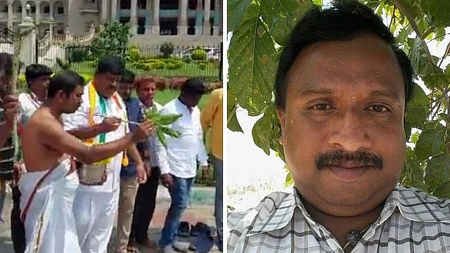 कर्नाटकता भाजपला पराभवाची धुळ चारत काँग्रेसने एकहाती सत्ता मिळवली. यानंतर मुख्यमंत्री, उपमुख्यमंत्र्यासह मंत्रीमंडळाचा शपथविधी सोहळा देखील अगदी उत्साहात पार पडला. सत्ता स्थापन केल्यानंतर कर्नटकच्या विधानसभेत काँग्रेसच्या आमदारांनी पहिल्यांदा पाऊल ठेवले. यावेळी काँग्रेसच्या कार्यकर्त्यांकडून विधानसभा परिसराची गोमुत्र शिंपडून तसेच पुजा करुन शुद्धता करण्यात आल्याचे सांगितले जात आहे. या घटनेचा व्हिडिओ सोशल मीडियावर व्हायरल होत आहे. या व्हिडिओत काँग्रेस समर्थक एका पुजाऱ्याला सोबत घेवून विधानसभेच्या परिसरात गोमुत्र आणि डेटॉल शिंपडताना दिसून येत आहे. तसेच बाजूला पुजा देखील मांडण्यात आल्याचे दिसत आहे.