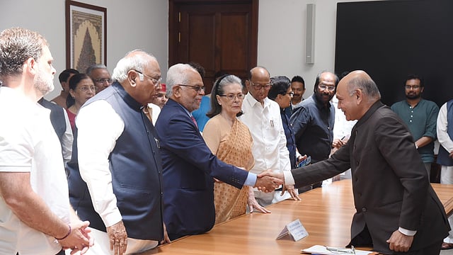 नवी दिल्ली : इंडिया आघाडीचे उपराष्ट्रपतीपदाचे उमेदवार, सर्वोच्च न्यायालयाचे निवृत्त न्यायमूर्ती बी. सुदर्शन रेड्डी यांनी गुरुवारी आपला उमेदवारी अर्ज दाखल केला. यावेळी काँग्रेसचे राष्ट्रीय अध्यक्ष मल्लिकार्जुन खर्गे, काँग्रेस संसदीय पक्षाच्या अध्यक्षा सोनिया गांधी आणि लोकसभेतील विरोधी पक्षनेते खासदार राहुल गांधी उपस्थित होते.