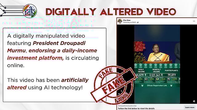 सध्या सोशल मीडियावर राष्ट्रपती द्रौपदी मुर्मू यांचा एक व्हिडिओ व्हायरल होत आहे. फक्त ₹२३ हजारांची गुंतवणूक करून दररोज ₹७०,००० आणि महिन्याला तब्बल ₹२१ लाखांची हमी राष्ट्रपती देत असल्याचा दावा या व्हिडिओमध्ये करण्यात आला आहे. मात्र, हा दावा पूर्णपणे खोटा असून हा व्हिडिओ AI-जनरेटेड असल्याचे स्पष्ट झाले आहे.
