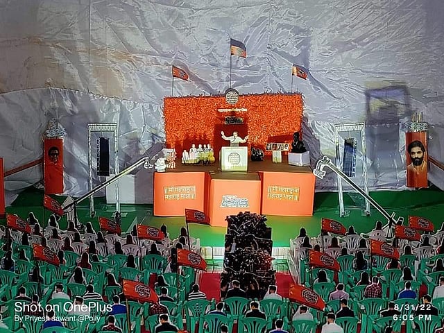 राज ठाकरे यांचे विचार घरोघरी पोहचावेत यासाठी हा देखावा अक्षय कदम यांच्याकडून साकारण्यात आला असून त्याच्या या देखाव्याची सध्या नवी मुंबई शहरात जोरदार चर्चा सुरु आहे. मनसेप्रमुख राज ठाकरे म्हंटल की तुफान गर्दी, विरोधकांवर जोरदार टोलेबाजी आणि सर्वसामान्यांना विचार करायला लावेल असे वक्तृत्त्व. दुकानांवरील मराठी पाट्या असो किंवा टोलबंद आंदोलन असो. अलीकडेच हाती घेण्यात आलेला मशिदींवरील भोंग्यांचा विषय असो. कायम आपल्या आक्रमक आणि अभ्यासू शैलीतून विरोधकांना धारेवर धरत महाराष्ट्र घडवण्यासाठी मनसेप्रमुख राज ठाकरे यांची धडपड सुरु आहे. त्यांच्या विचारांनी प्रेरित होत अनेक तरुणतरुणी पुढे सरसावले आहेत. ठाकरे यांचे हे विचार घरोघरी पोहचता यावे यासाठी वेगवेगळे उपक्रम सुरु असून गणेशोत्सवाच्या पार्श्वभूमीवर यात आणखी भर पडली आहे. नवी मुंबईतील नेरुळचा रहिवासी असलेल्या अक्षय कदम या मनसैनिकाने आपल्या घरच्या बाप्पाभोवती चक्क मनसेप्रमुख राज ठाकरे यांच्या भव्य दिव्य सभेचा देखावा उभारला आहे. 'राजगर्जना' या संकल्पनेवर आधारित या देखाव्यात राज ठाकरे सभेला मार्गदर्शन करतानाच्या प्रतिकृती साकारण्यात आल्या असून राज ठाकरे यांची गाजलेली अनेक भाषणे या देखाव्यावेळी ऑडिओ क्लिपद्वारे येणाऱ्या भक्तांना ऐकवण्यात येत आहेत. पर्यावरणपूरक वस्तूंचा वापर करत अक्षय कदम यांच्यासोबत प्रियेश सावंत, मंगेश चौगुले, अनिकेत गोळे आदी सहकाऱ्यानी मिळून देखावा साकारला आहे.