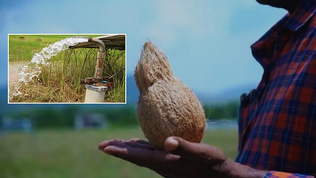 नारळाच्या मदतीने पाणी शोधण्यासाठी पाणी असलेला नारळ वापरतात. ज्या प्लॉटमध्ये किंवा शेतामध्ये पाण्याचा शोध घ्यायचा आहे तेथे त्या नारळची पूजा मांडतात. पूजेनंतर नारळाच्या डोळ्याच्या भागाकडे काही जटा (शेंडी) ठेवून त्याला पूर्ण सोलून घेतात. पाणाडी आपला उजवा तळहात आकाशाकडे व जमिनीला समांतर असा धरतो. शेंडी बोटाच्या दिशेने असेल अशा पद्धतीने तो नारळ तळहातावर ठेवतो आणि प्लॉट/शेतामध्ये पाण्याचा शोध घेत फिरतो. ज्या ठिकाणी नारळ उभा राहिला (जमिनीला समांतर असलेली शेंडी काटकोनात येते) त्या ठिकाणी जमिनीखाली पाणी आहे असं सांगतो.