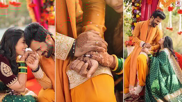 साखरपुड्याच्या फोटोंमध्ये अक्षयाने हिरव्या रंगाची साधी साडी नेसली होती आणि सिम्पल, सुबक लूक दिसत होता, तर विशालने पिवळ्या आणि नारंगी शेडची शेरवानी परिधान केली होती.