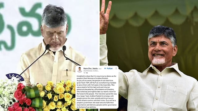 “आंध्र प्रदेशच्या जनतेचा मुख्यमंत्री म्हणून मी माझे कर्तव्य पुन्हा सुरू करतोय, हे सांगायला आनंद होत आहे. तुम्हा सर्वांना माहीत आहे की, आपल्या राज्यातील जनतेने टीडीपी-जेएसपी-भाजपला विधानसभेच्या १६४ जागांसह सेवा करण्यासाठी जबरदस्त जनादेश दिला आहे. आमच्या तळागाळातील कार्यकर्त्यांनी, पदाधिकारी आणि नेत्यांनी केलेल्या मेहनतीचे हे फळ आहे, ज्यांनी आमचे भविष्यासाठीचे व्हिजन लोकांपर्यंत पोहोचवण्यासाठी रात्रंदिवस काम केले. त्यांच्यामुळे आंध्र प्रदेशमध्ये मोठ्या टीमचा उदय होण्याचा मार्ग मोकळा झाला, राज्यभरातील जनतेनीही त्यांच्या मतांसह आमचा चौथा सहयोगी भागीदार म्हणून एकजुटीने भूमिका घेतली." असे नायडू यांनी लिहिले. आपले नवे सरकार लोकांच्या अपेक्षा पूर्ण करण्यासाठी प्रयत्नशील राहील, असे प्रतिपादन करून, "आमचे सरकार हे लोकांचे सरकार असेल. त्यांच्या अपेक्षा पूर्ण करण्यासाठी आम्ही प्रयत्नशील राहू आणि आमच्या पूर्ण क्षमतेनुसार लोककेंद्रित प्रशासन देऊ" असेही त्यांनी म्हटले.