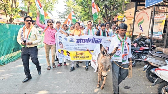 भाईंंदर : मीरा-भाईंदरमधील राष्ट्रवादी काँग्रेस पार्टीच्या वतीने सध्या महाविकास आघाडीतील प्रमुख नेते तसेच राष्ट्रवादी काँग्रेसचे युवा आमदार रोहित पवार यांच्यावर ईडीकडून सातत्याने सूडबुद्धीची कारवाई सुरू असून त्यात दोषी असणाऱ्या व भाजपमधील तसेच भ्रष्टाचाराचे आरोप करून मग भाजपमध्ये गेलेल्यांना मात्र संरक्षण दिले जात आहे, असा आरोप करत शरद पवारांची राष्ट्रवादी काँगेस पक्षाने गाढव मोर्चा काढून भाजप व सरकारचा तसेच ईडीचा निषेध व्यक्त करण्यात आला. जनतेचे ऐकू नका पण या गाढवाचे तर ऐका म्हणत घोषणा देण्यात आल्या व त्याचे निवेदन अप्पर तहसीलदार निलेश गौंड यांना देण्यात आले.