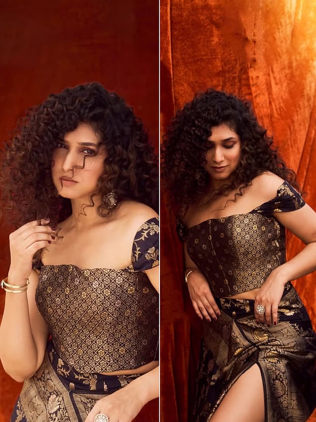 बनारसी सिल्कवरील सोनेरी नक्षीकाम आणि काळ्या रंगाची झलक प्रियदर्शिनीच्या लूकला रिच फिनिश देते. साडीचा पदर किंवा बॉर्डर अशा पद्धतीने वापरून ड्रेस अधिक खास बनवता येतो.