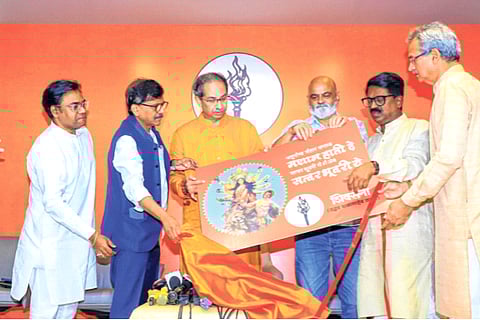 आजपासून नवरात्र सुरू झाला आहे. जगदंबेचा उत्सव आहे. महिषासूर मर्दिनी, असुरांचा वध करून, जे असूर माजले होते, त्याचा वध करणाऱ्या मातेचा हा दिवस आहे, असेही उद्धव ठाकरे म्हणाले. आजची राजकीय पत्रकार परिषद नाही. राज्यात जे अराजक माजले आहे. त्यावर एक गाणे आहे. राज्यात सध्या तोतयेगिरी सुरू आहे. असेच अराजक शिवाजी महाराजांच्यावेळी राज्यावर आले होते तेव्हा एकनाथांनी ‘बये दार उघड’ अशी आरोळी मारली होती. या तोतयेगिरीचा नायनाट करण्यासाठी आपण गाणे तयार केले आहे. देवी आणि जनतेच्या चरणी हे गाणे सादर करत आहोत. गाणे ऑडिओ आहे, असेही उद्धव ठाकरेंनी सांगितले.
