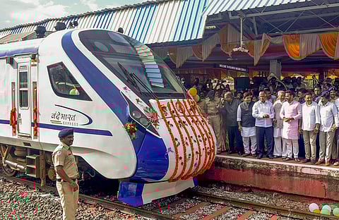 कोल्हापूर/कराड: कोल्हापूर येथील छत्रपती शाहू टर्मिनल्स येथून सोमवारी सायंकाळी ४.२० वाजता 'वंदे भारत' पुण्याकडे रवाना झाली. केंद्रीय रेल्वे राज्यमंत्री व्ही. सोमन्ना यांच्या हस्ते या रेल्वेला हिरवा झेंडा दाखविला.