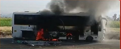 कराड : पुणे - बंगळुरू राष्ट्रीय महामार्गावरून निघालेल्या मुंबईतील आयआयटीच्या विद्यार्थ्यांच्या खासगी लक्झरी बसला अचानक भीषण आग लागल्याची घटना बुधवारी सकाळच्या सुमारास आनेवाडी टोलनाक्याजवळ घडली. दरम्यान, चालकाने प्रसंगावधान दाखवून ३२ मुला-मुलींना तातडीने बसमधून खाली उतरवल्यामुळे मोठा अनर्थ टळला. मुंबईतील आयआयटीमध्ये शिक्षण घेणारी ३२ मुले आणि मुली खासगी लक्झरी बसने पुणे - बंगळुरू राष्ट्रीय महामार्गावरून साताऱ्याकडे जाण्यासाठी निघाले होती.