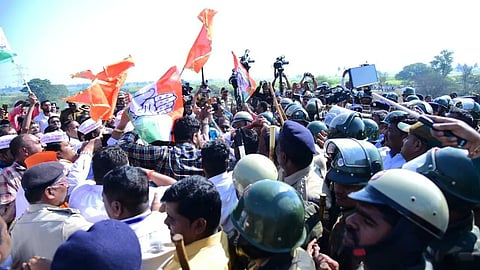 कर्नाटक पोलिसांनी रोखल्यानंतर नेत्यांनी कार्यकर्त्यांसह ठिय्या आंदोलन केले. "बेळगावमधील मराठी भाषिकांच्या महामेळाव्याला जाणाऱ्या महाराष्ट्रातील नेतेमंडळी व कार्यकर्त्यांना अडवणे हे कर्नाटकचे धोरण लोकशाहीविरोधी आहे. मराठी भाषिकांवर दडपाशाही करणाऱ्या कर्नाटक सरकारची गुंडगिरी खपवून घेणार नाही," असा इशारा हसन मुश्रीफ यांनी दिला. यावेळी सुमारे एक-दीड तास कर्नाटक पोलीस आणि महाविकास आघाडीचे नेते आणि कार्यकर्त्यांमध्ये गोंधळ सुरु होता.