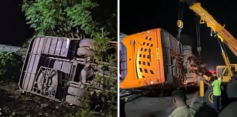 डोंबिवलीमधील निळजे घेसरगांव येथे राहणारे सत्यवान गायकर यांनी पंढरपूर यात्रेला जाणाऱ्या भाविकांसाठी प्रत्येकी १८०० रुपये घेऊन खंडेराय ट्रॅव्हल्स या खासगी बसची सोय केली होती. त्यामुळे जुनी डोंबिवली तसेच निळजे घेसरगांव भागातील ४२ भाविक पंढरपूर यात्रेला जाण्यासाठी या बसमधून मंगळवारी, १५ जुलैला रात्री १०.३० वाजता निघाले होते. सदर बसमध्ये दहिसर येथे आणखी १० भाविक चढले. बसमधील भाविकांमध्ये २५ महिला होत्या. सदर बस मध्यरात्री १२.३० वाजण्याच्या सुमारास मुंबई-पुणे एक्स्प्रेस मार्गावर आल्यानंतर साधारण ५ कि.मी. अंतरावर बसचालकाला त्यांच्यापुढे असलेल्या ट्रॅक्टरचा अंदाज आला नाही. त्यामुळे भाविकांची बस वेगाने ट्रॅक्टरवर धडकली. ही धडक इतकी जबरदस्त होती की या भाविकांची बस रस्त्याच्या बाजूला असलेला संरक्षक कठडा तोडून रस्त्यालगतच्या पाइपलाईनवर धडकून पलटी झाली. त्यामुळे बसमधील सर्व भाविकांना किरकोळ तसेच गंभीर स्वरूपाच्या जखमा झाल्या. पनवेल शहर पोलिसांना या घटनेची माहिती मिळताच त्यांनी घटनास्थळी धाव घेऊन सर्व जखमी भाविकांना कामोठे येथील एमजीएम हॉस्पिटलमध्ये दाखल केले. मात्र, त्यापैकी एका महिलेसह तिघांचा मृत्यू झाला. या अपघातात ट्रॅक्टरचालक आणि त्याचा सहकारीदेखील गंभीर जखमी झाले. त्यांना रुग्णालयात नेले असता डॉक्टरांनी मृत घोषित केले.