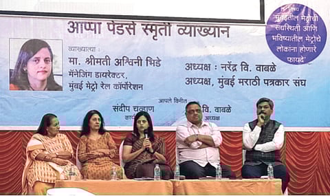 मुंबई मराठी पत्रकार संघाने गुरुवारी आयोजित केलेल्या आप्पा पेंडसे स्मृती व्याख्यानमालेत अश्विनी भिडे म्हणाल्या की, “मुंबई व उपनगर मेट्रोचे जाळे निर्माण करत असताना अनेक प्रकारचे बोगदे खोदकाम खणण्यात आले. जगभरातील तंत्रज्ञानाचा वापर करत मुंबईकरांचे जनजीवन विस्कळित न होता, रस्त्यावरील वाहतूक खंडित न करता, पायाभूत सोयीसुविधा, जमीन हस्तांतरण, ट्रॅफिक नियम, पर्यावरण काळजी, कामगारांची काळजी, सुरक्षितता, गुणवत्ता, भुयारी कार्य करताना शेजारील जुन्या इमारतीची सुरक्षा, खोदकाम करताना तात्पुरते शिफ्टिंग, नागरी पाणीपुरवठा नळपाईपची काळजी, २४ तास धावणाऱ्या मुंबई शहरात वाहतूक सुरू ठेवत सुरू असलेले भुयारी काम, सरकारी जागा संपादन करणे, झोपडीधारक स्थलांतर, पक्के सदनिकाधारक यांचे स्थलांतर, या व इतर अनेक गोष्टी कराव्या लागल्या. तसेच तांत्रिक, कायदेशीर, पर्यावरण, हेरिटेज, विमानतळ प्राधिकरण विभागाच्या परवानग्या घेत मुंबई मेट्रोचे कार्य अखंडितपणे सुरू आहे. जमिनीखाली कसे काम सुरू आहे, याची माहिती मीडियाने जनतेला देत मोठे सहकार्य केले,” असे भिडे यांनी यावेळी सांगितले.