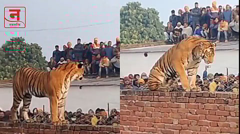 वाघ म्हटलं म्हणजे भल्याभल्यांची भंबेरी उडते. वाघ अचानक आपल्या समोर येऊन उभा राहिल्यास आपलं काय होईल, याचा विचार देखील केला जात नाही. सध्या वाघाचा एक व्हिडिओ सोशल मीडियावर मोठ्या प्रमाणावर व्हायरल होत आहे. यात उत्तर प्रदेशातील एका गावात एक वाघ शिरल्याचे दिसत आहे. हा वाघ एका भींतीवर उभा असून त्याला पाहण्यासाठी लोकांनी गर्दी केली. तसेच वाघाने आपल्यावर हल्ला करुन नये यासाठी लोकांनी तो उभ्या असलेल्या परिसराला कुंपण देखील घातले आहे.