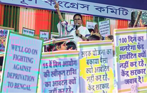 राज्यातील २१ लाख मनरेगा कर्मचाऱ्यांनी योजनेच्या नियमांनुसार दरवर्षी किमान १०० दिवस काम केले आहे. तरीही गेल्या तीन वर्षांपासून त्यांना त्याचा ठरलेला मोबदला मिळालेला नाही. केंद्र सरकारने राज्यातील विविध जनकल्याण योजनांसाठीचा निधी तीन वर्षांपासून दिलेला नाही. हा निधी तातडीने देण्यात यावा, यासाठी ममता बॅनर्जी यांनी कोलकाता शहरातील डॉ. बाबासाहेब आंबेडकर यांच्या पुतळ्यासमोर शुक्रवारपासून ४८ तासांचे धरणे आंदोलन सुरू केले आहे.