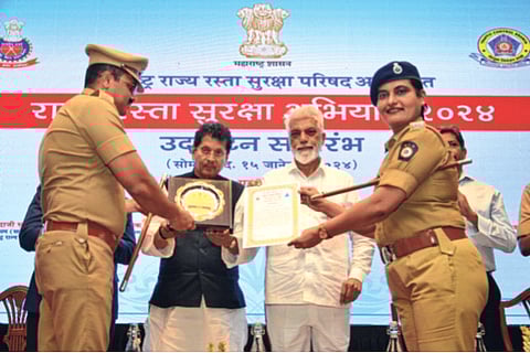 परिवहन विभागातर्फे राज्य रस्ता सुरक्षा अभियान २०२४ चा उद्घाटन सोहळा मुंबईतील सह्याद्री अतिथीगृह पार पाडला. यावेळी सार्वजनिक बांधकाम मंत्री दादाजी भुसे आणि शालेय शिक्षण मंत्री दीपक केसरकर यांच्या हस्ते नवी मुंबईच्या वाहतूक विभागाचे पोलीस उपायुक्त तिरुपती काकडे आणि उप प्रादेशिक परिवहन अधिकारी हेमांगिनी पाटील यांचा सन्मानचिन्ह आणि प्रमाणपत्र देऊन गौरव करण्यात आला.