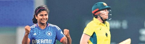 त्यापूर्वी, प्रथम फलंदाजी करताना ऑस्ट्रेलियाचा डाव १९.२ षटकांत १४१ धावांत संपुष्टात आला. १९ वर्षीय मध्यमगती गोलंदाज तितासने बेथ मूनी (१७), ताहिला मॅकग्रा (०), ॲश्लेघ गार्डनर (०) आणि ॲनाबेल सदरलँड (१२) यांचे महत्त्वपूर्ण बळी मिळवले. युवा फोबे लिचफील्ड (३२ चेंडूंत ४९) आणि एलिस पेरी (३० चेंडूंत ३७) यांनी पाचव्या विकेटसाठी ७९ धावांची भागीदारी रचून ऑस्ट्रेलियाला सन्मानजनक धावसंख्येपर्यंत पोहोचवले. फिरकीपटू अमनजोत कौरने लिचफील्डचा, तर दीप्ती शर्माने पेरीचा अडथळा दूर केला.