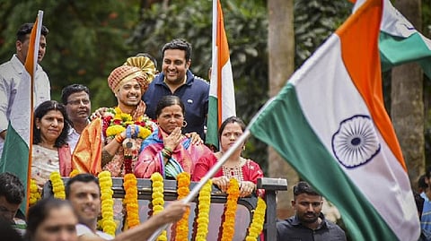 पुणे : ऑलिम्पिक कांस्य पदक विजेता नेमबाज स्वप्नील कुसळे याचे भारतात आगम झाल्यानंतर गुरुवारी पुण्यात त्याचे जंगी स्वागत करीत जाहीर सत्कार करण्यात आला. महाळुंगे बालेवाडी येथील श्री शिवछत्रपती क्रीडा संकुल या ठिकाणी स्वप्नील यांची उघड्या जीपमधून भव्य स्वागत करीत मिरवणूक काढण्यात आली. त्यानंतर स्टेडियममध्ये झालेल्या कार्यक्रमात मंत्री चंद्रकांत पाटील, क्रीडाआयुक्त डॉ राजेश देशमुख, ऑलिम्पिक ज्युरी पवन सिंह, स्वप्नील यांच्या प्रशिक्षक दिपाली देशपांडे, आई अनिता कुसळे, वडील सुनील कुसळे, अक्षय अष्टपुत्रे आदी मान्यवर यावेळी व्यासपीठावर उपस्थित होते. दगडूशेठ हलवाई गणपतीची मूर्ती, शाल, श्रीफळ, पुणेरी पगडी देत यावेळी स्वप्नील यांचा सत्कार करण्यात आला. उपमुख्यमंत्री देवेंद्र फडणवीस यांनी देखील दूरध्वनीवरून संपर्क साधत स्वप्नील यांचे अभिनंदन केले.
